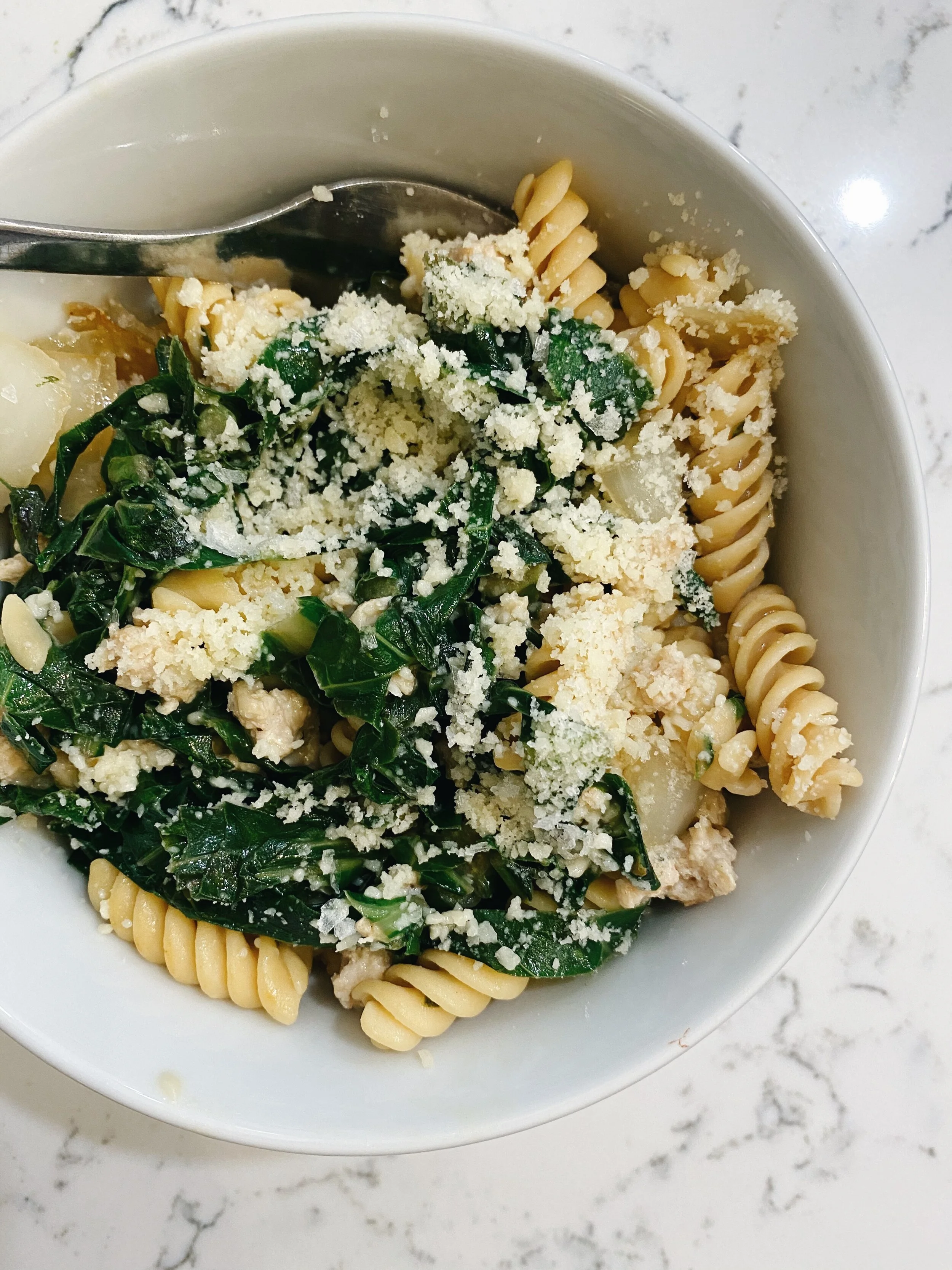 Cook the pasta according to the instructions on the box. Drain and add to the sausage and greens. Toss until well combined.